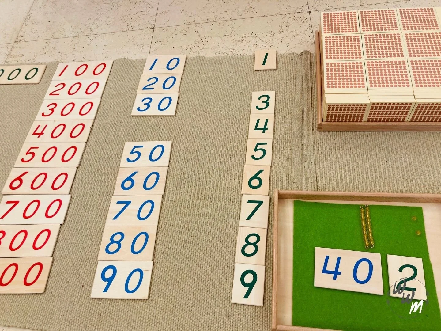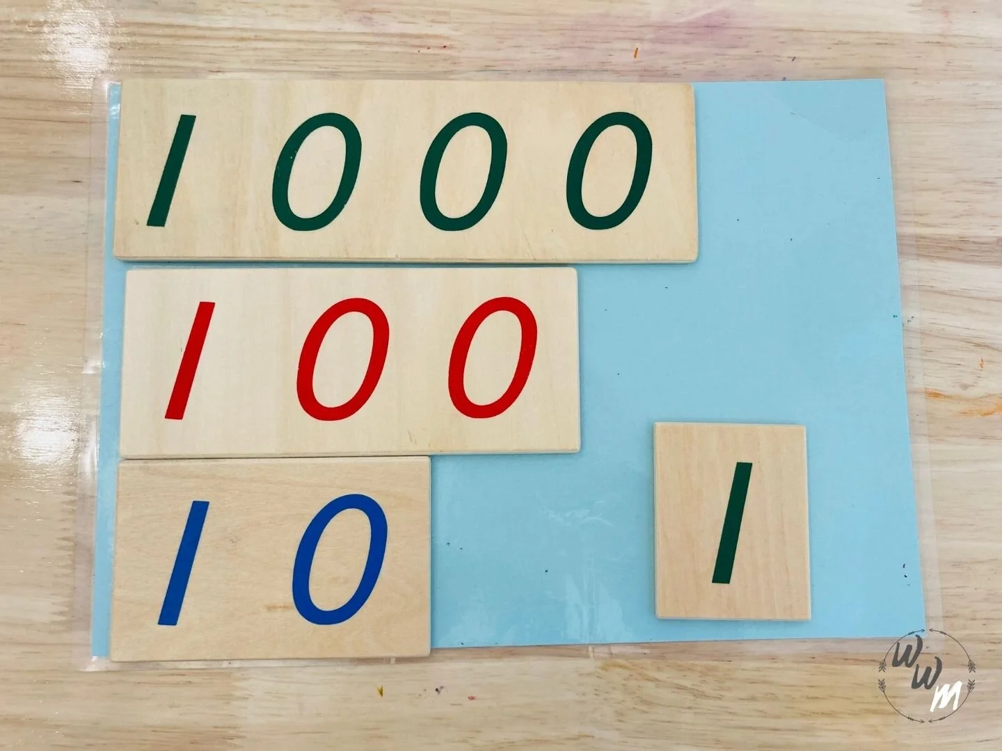 The aim of this activity is to teach the child the written numbers for 1, 10, 100, and 1000. The directress does a three-period lesson with the Montessori Large Number Cards. The child learns how to identify one unit, one ten, one hundred, and one thousand in a more ‘abstract’ way.