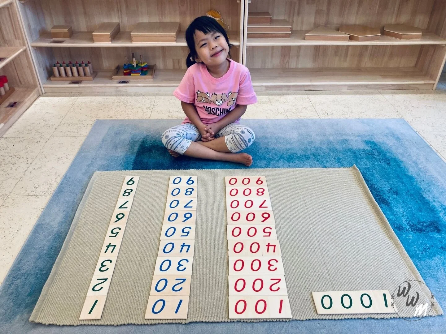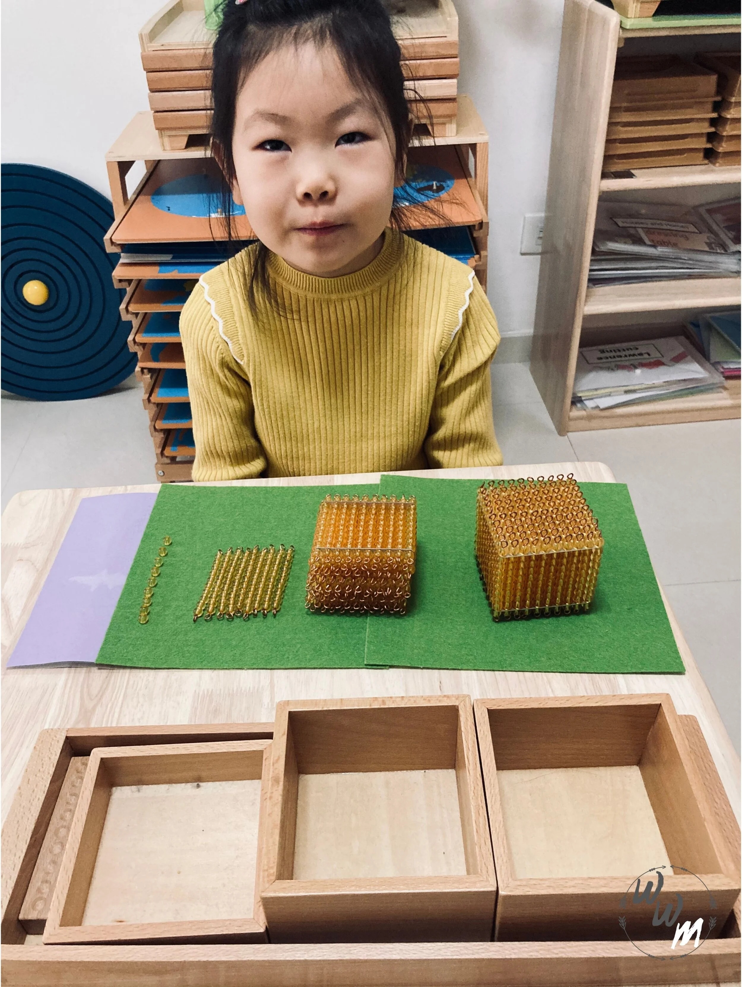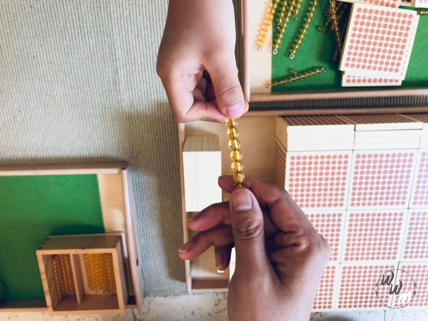 In Montessori, we always begin with teaching the child with more concrete materials and move onto more abstract materials. In Montessori, we introduce numerals of the Decimal System to the child in early Montessori Math lessons. In this area of math, the child is introduced to zero as a place value. The Golden Beads are fascinating for all children and helps them learn concepts easily.