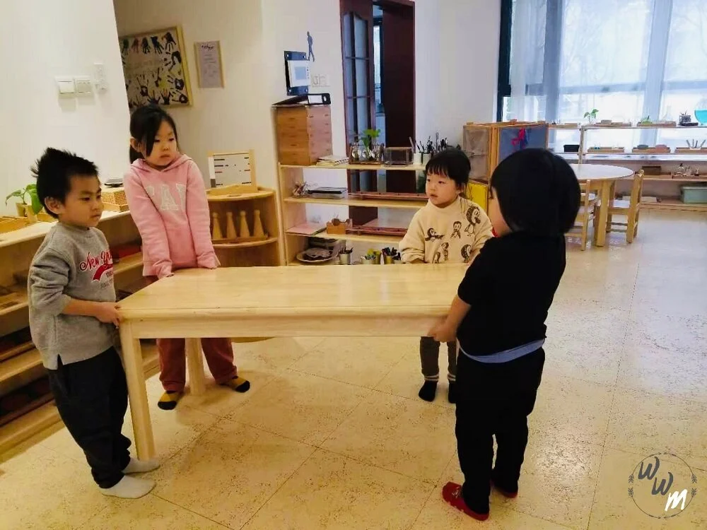 This is an interesting Montessori preliminary task because tables are heavy and children need to collaborate and work together to carry a table. This means children must problem-solve together to complete the task of carrying a table.