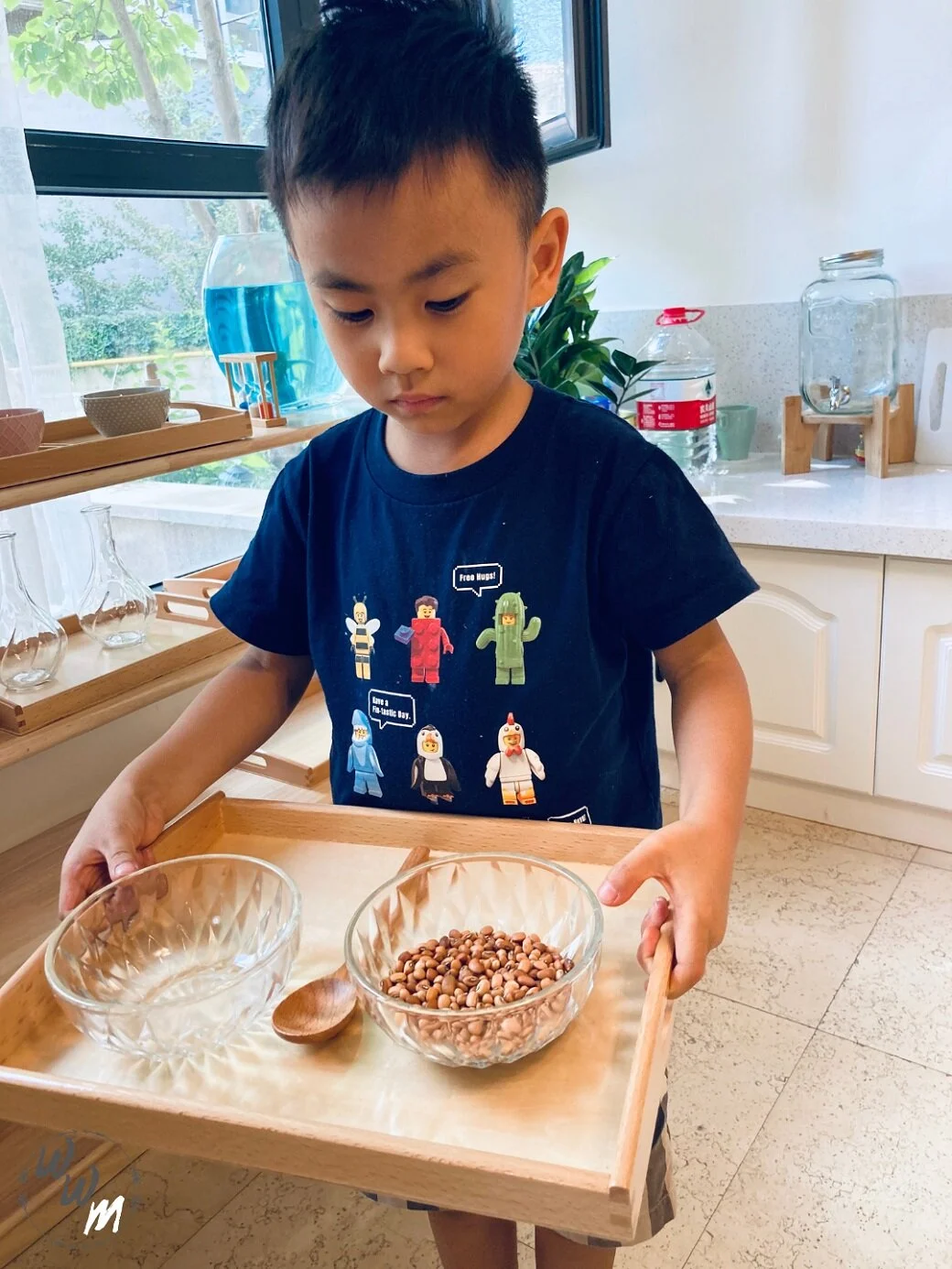 Children will very often be carrying a tray in class. This is an important Montessori preliminary skill to master because the child will need to carry their materials by themselves daily. They need to learn to carry trays safely, too.