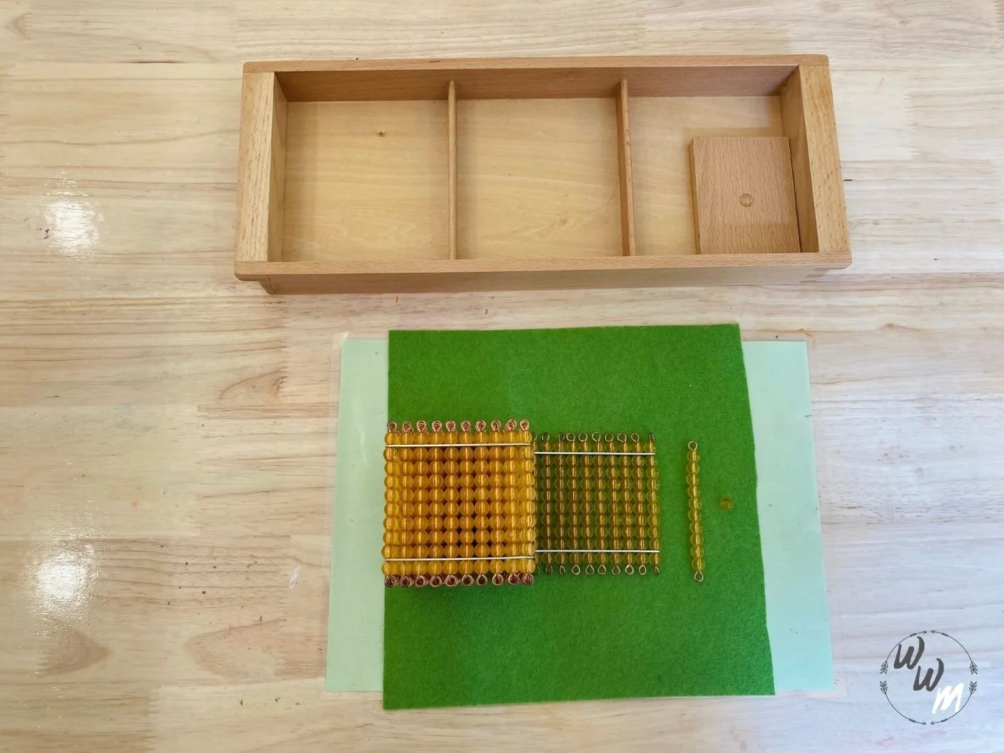 This is a wonderful and interactive introduction to the decimal system. The child learns the correct names of the beads. This activity is done by the directress doing a three-period lesson with the child. The directress places the piece of felt down so the beads don’t roll around.
