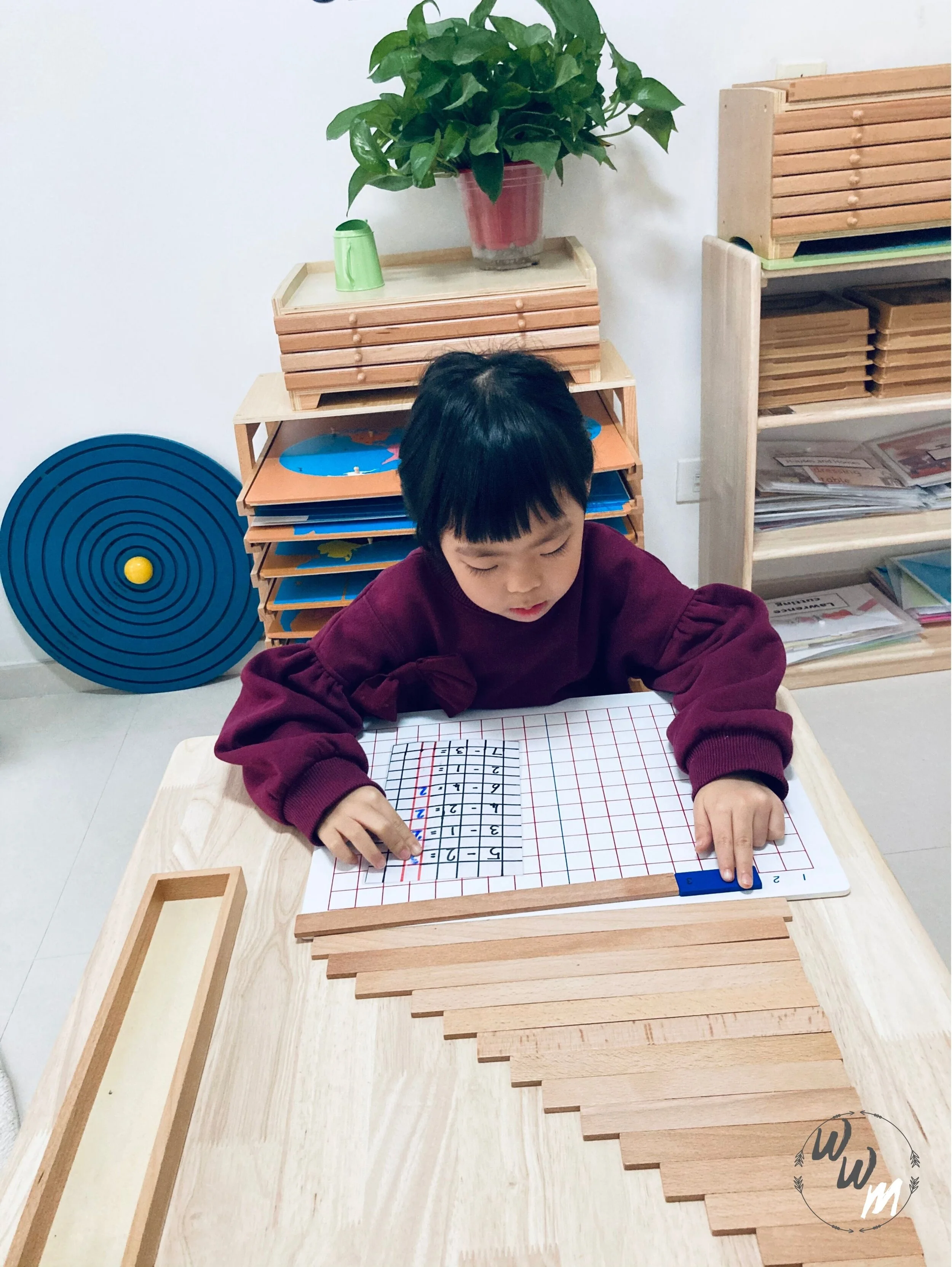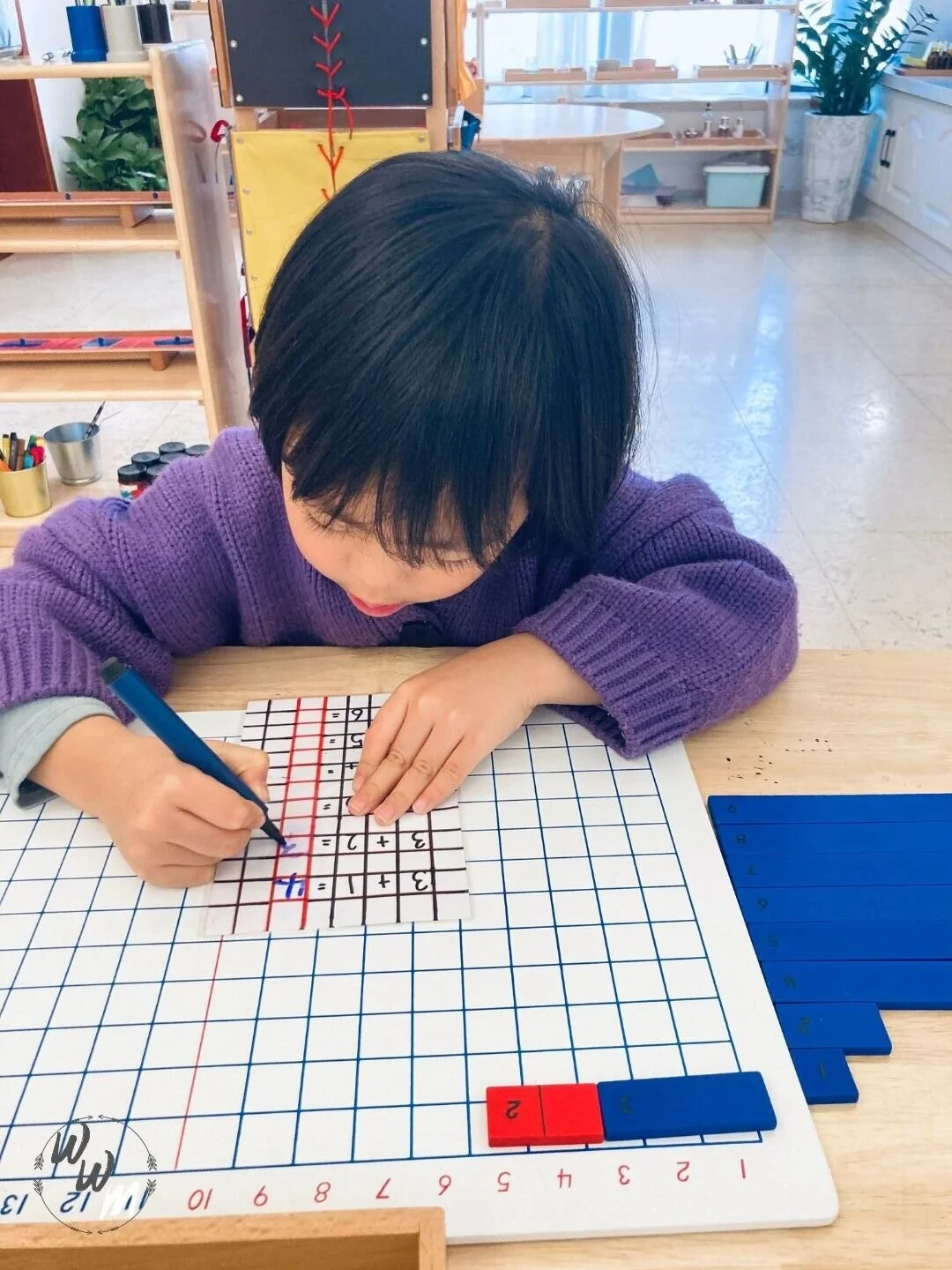The second presentation with the Montessori Addition Strip Board is similar to the first one. This activity increases in difficulty, as the child is encouraged to find the sum of an operation, using the addition strip board, and recording the answer on the sum card.